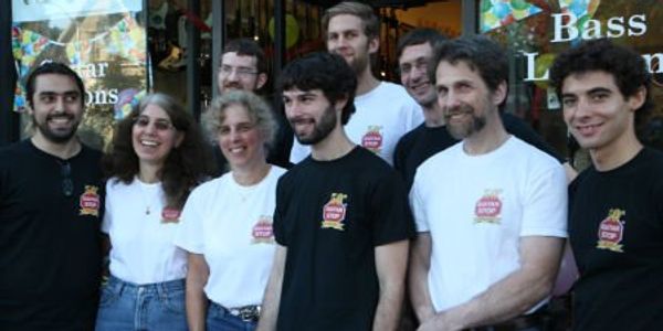 Collage of Guitar Stop's Second location: Alex Oster playing a Ukulele 3 yrs old, Annette Osgood (Oster) at counter, Jeanne Oster & Annette at the microphone, Alex at the Bulletin Board during name change from Central Sales Co to Guitar Stop Celebration in 1998 , Inside & Outside current location 1999- Present